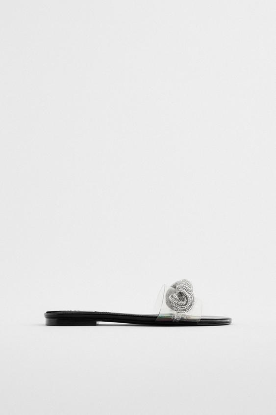 #Flat | Transparent flat sandals. Front vinyl strap with interwoven sparkly straps. AIRFIT®. Flexible technical sole made of latex foam designed to offer increased comfort. Sole height: 0.6 inches (1.5 cm)